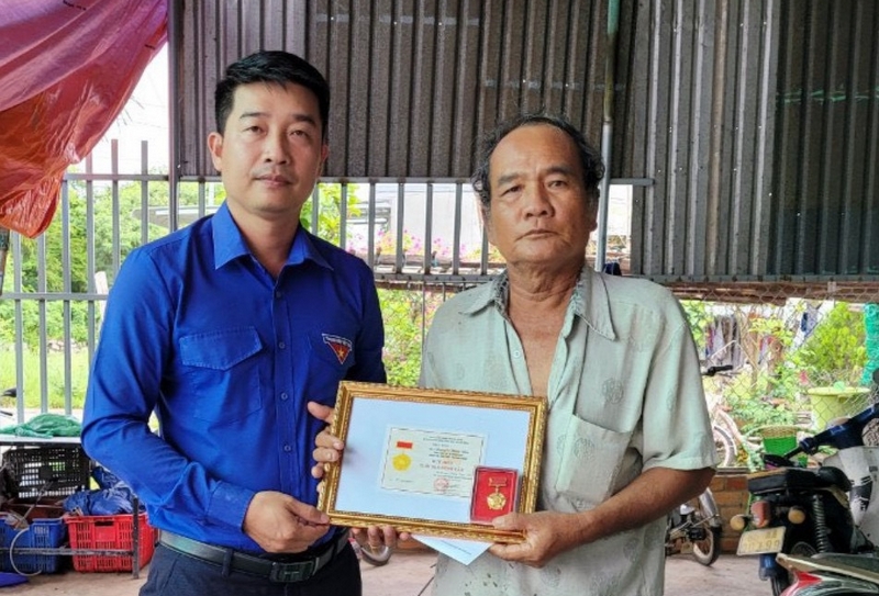 Đồng chí Thái Thành Bi - Phó Bí thư Thường trực Tỉnh đoàn, chủ tịch Hội LHTN Việt Nam tỉnh trao quyết định truy tặng danh hiệu “Tuổi trẻ dũng cảm” cho thanh niên Nguyễn Hữu Đốn