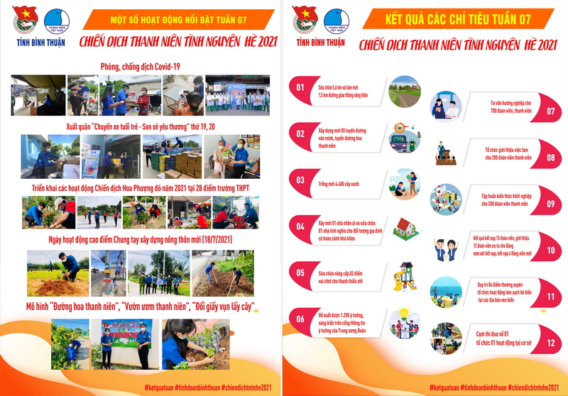 Tuần 7 chiến dịch Thanh niên tình nguyện hè đã trôi qua, những kết quả mà tuổi trẻ Bình Thuận cùng nhau đạt được càng thể hiện rõ hơn nữa tinh thần xung kích tình nguyện, luôn cống hiến hết mình, sẵn sàng đương đầu với mọi khó khăn gian khổ của thế hệ thanh niên vì một mục tiêu chung xây dựng quê hương giàu đẹp./.