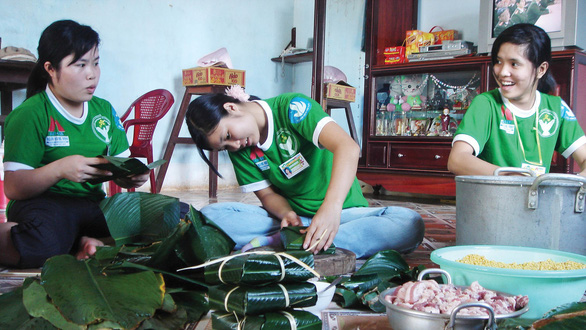Các bạn trẻ tham gia Xuân tình nguyện tại Trung tâm hướng nghiệp dạy nghề và giải quyết việc làm huyện Xuyên Mộc (Bà Rịa - Vũng Tàu) gói bánh chưng ở nhà người dân để tặng các học viên ăn Tết