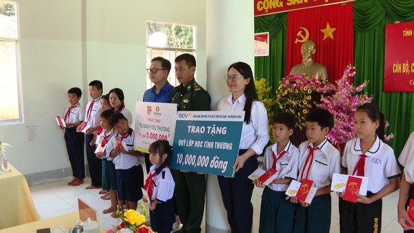 Đại diện lãnh đạo Tỉnh đoàn, Công ty Cổ phần Phân bón Dầu khí Cà Mau trao lì xì tết cho các em thiếu nhi trên đảo