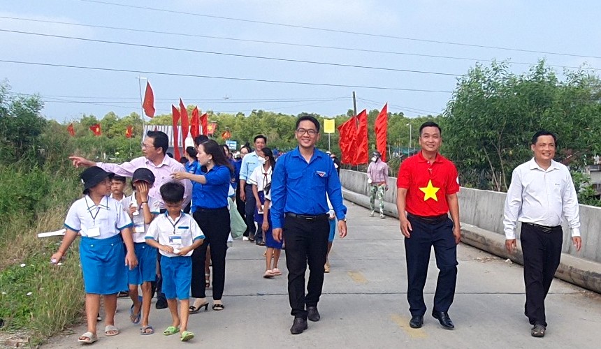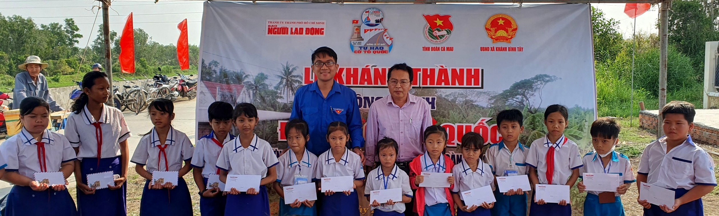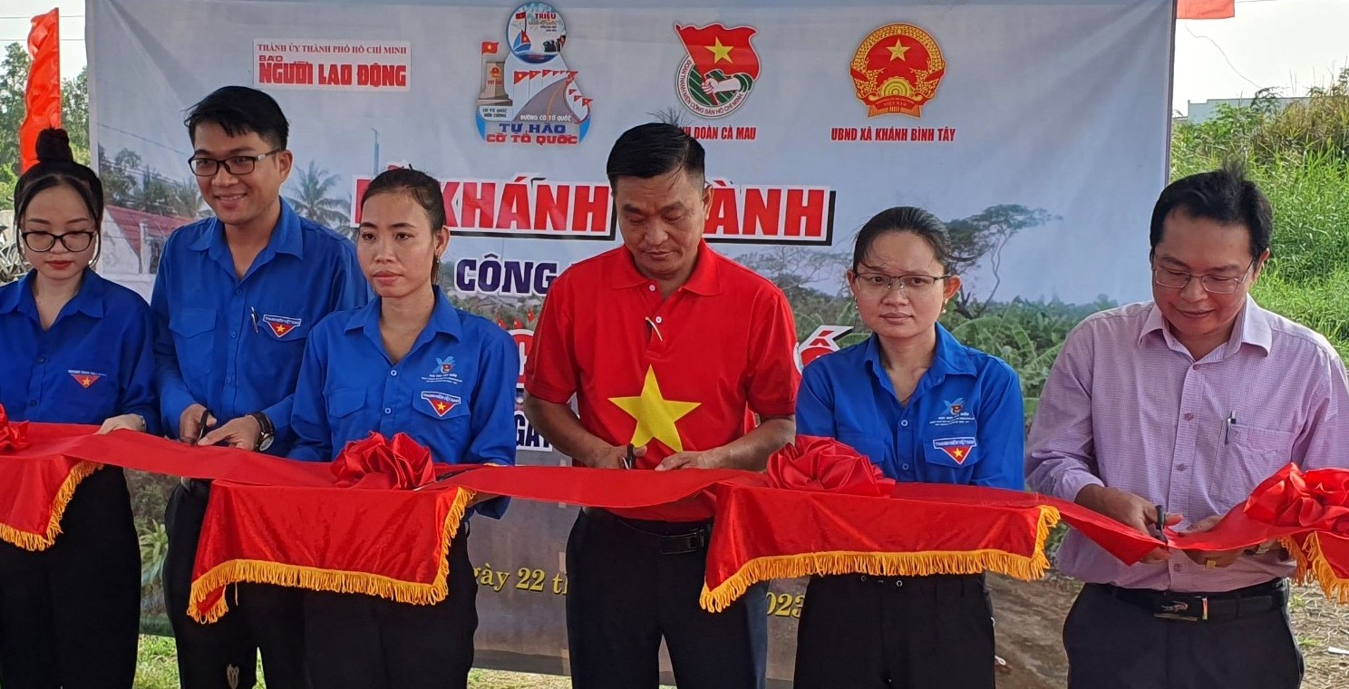 Đại diện lãnh đạo Tỉnh đoàn, Báo Người Lao động và Đảng ủy xã Khánh Bình Tây cắt băng khánh thành công trình “Đường cờ Tổ quốc”