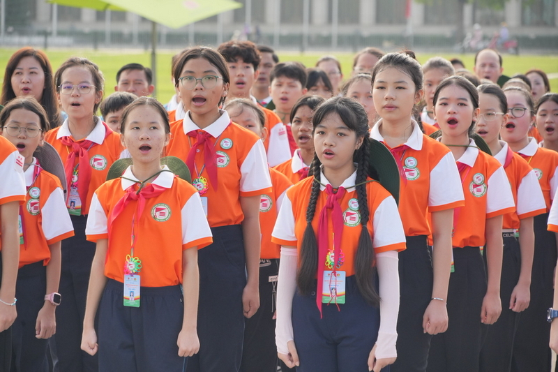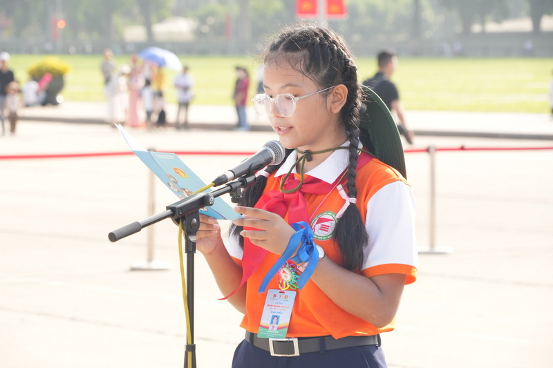 "Có mặt tại Quảng trường Ba Đình lịch sử báo công với Bác hôm nay, chúng cháu 207 thiếu nhi là cán bộ Chỉ huy Đội trên cả nước. Trong đó, có 05 bạn đạt danh hiệu học sinh giỏi quốc gia, 33 bạn đạt danh hiệu học sinh giỏi cấp tỉnh, 103 bạn là liên đội trưởng, 67 bạn là liên đội phó, 25 bạn là chi đội trưởng, nhiều bạn có hoàn cảnh khó khăn, nhưng tất cả chúng cháu đều cố gắng vươn lên, nỗ lực rèn đức, luyện tài, đạt được nhiều thành tích tốt trong học tập, rèn luyện và công tác Đội TNTP Hồ Chí Minh để hôm nay vinh dự được về đây báo công với Bác.