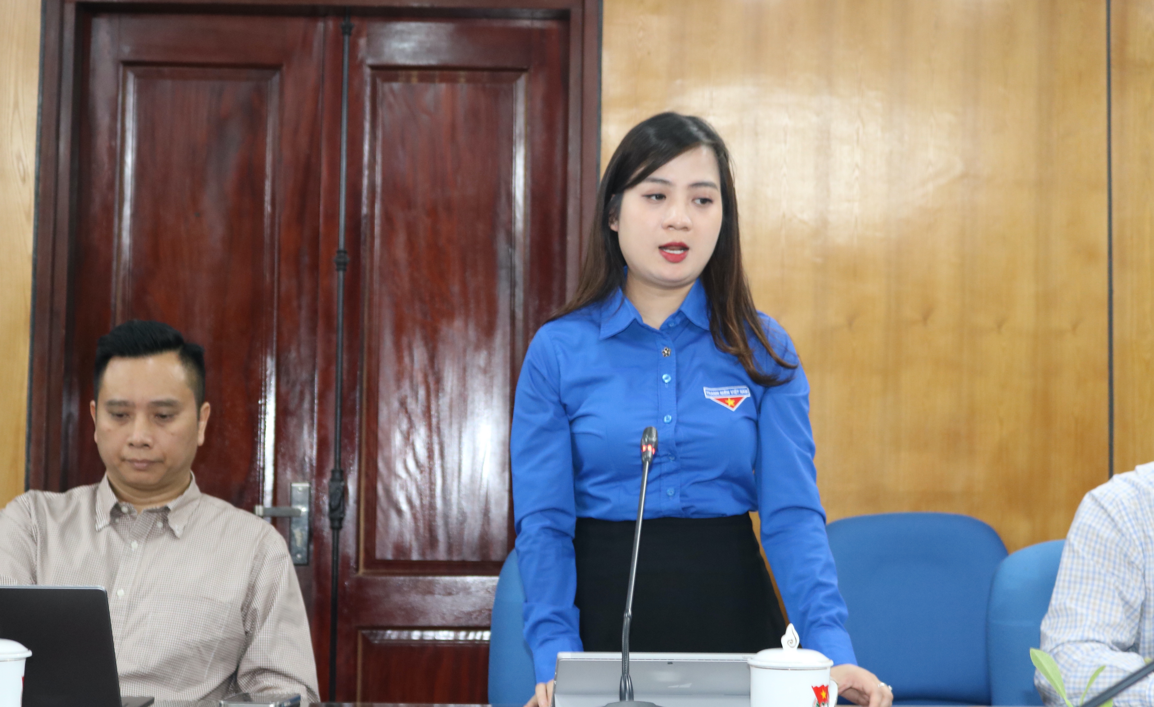 Đồng chí Nguyễn Lưu Trà My, Uỷ viên BCH, Phó Trưởng ban Đoàn kết tập hợp thanh niên Trung ương Đoàn phát biểu tại điểm cầu Trung ương