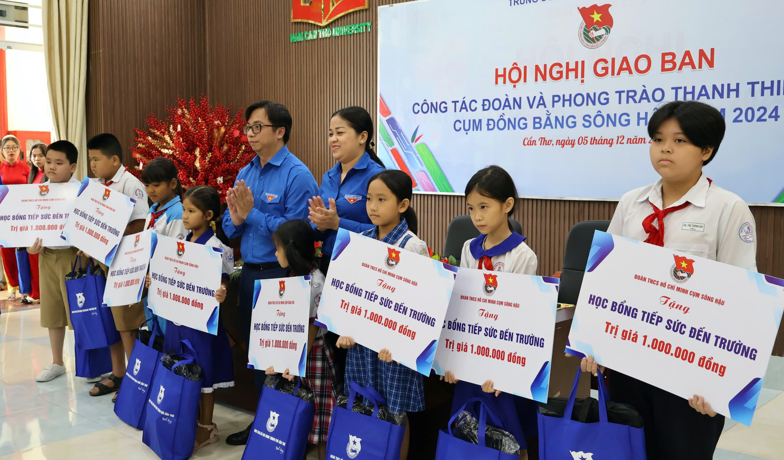 Trong khuôn khổ hội nghị, Đoàn TNCS Hồ Chí Minh cụm sông Hậu tặng các suất học bổng cho các em học sinh có hoàn cảnh khó khăn, mỗi suất trị giá 1.000.000 đồng. Ảnh: Bé Như