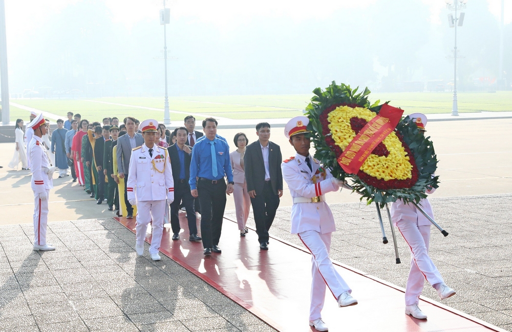 Bí thư T.Ư Đoàn Ngô Văn Cương cùng các đại biểu vào lăng viếng Chủ tịch Hồ Chí Minh. Ảnh: Dương Triều