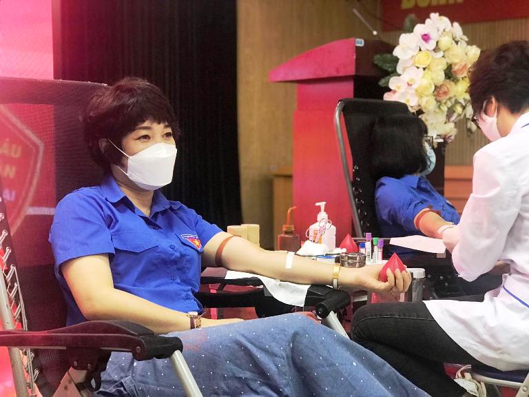 Chị Phạm Thị Thu Hòa, Phó Chủ tịch Công đoàn Cơ quan Trung ương Đoàn tham gia hiến máu tình nguyện
