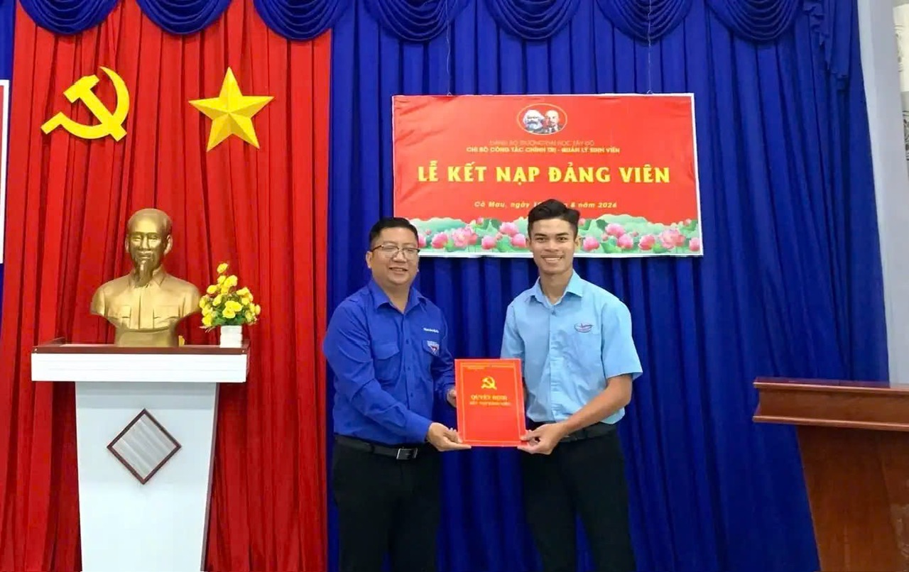 Đồng chí Trần Việt Tuấn, Phó Bí thư Thành đoàn Cần Thơ, trao quyết định kết nạp đảng viên cho SV Huỳnh Chí Nguyện. Ảnh: Đoàn Trường Đại học Tây Đô.