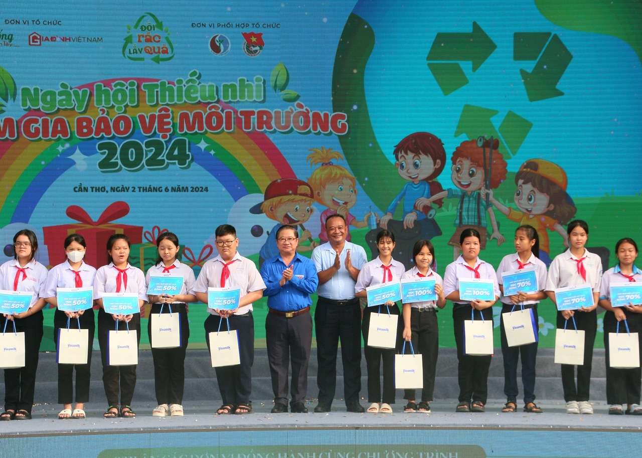 Đồng chí Trần Việt Trường, Phó Bí thư Thành ủy, Chủ tịch UBND TP Cần Thơ và đồng chí Nguyễn Ngọc Tâm, Ủy viên Ban Thường vụ, Trưởng Ban Tuyên giáo Thành ủy, tặng quà và học bổng cho học sinh vượt khó học tốt