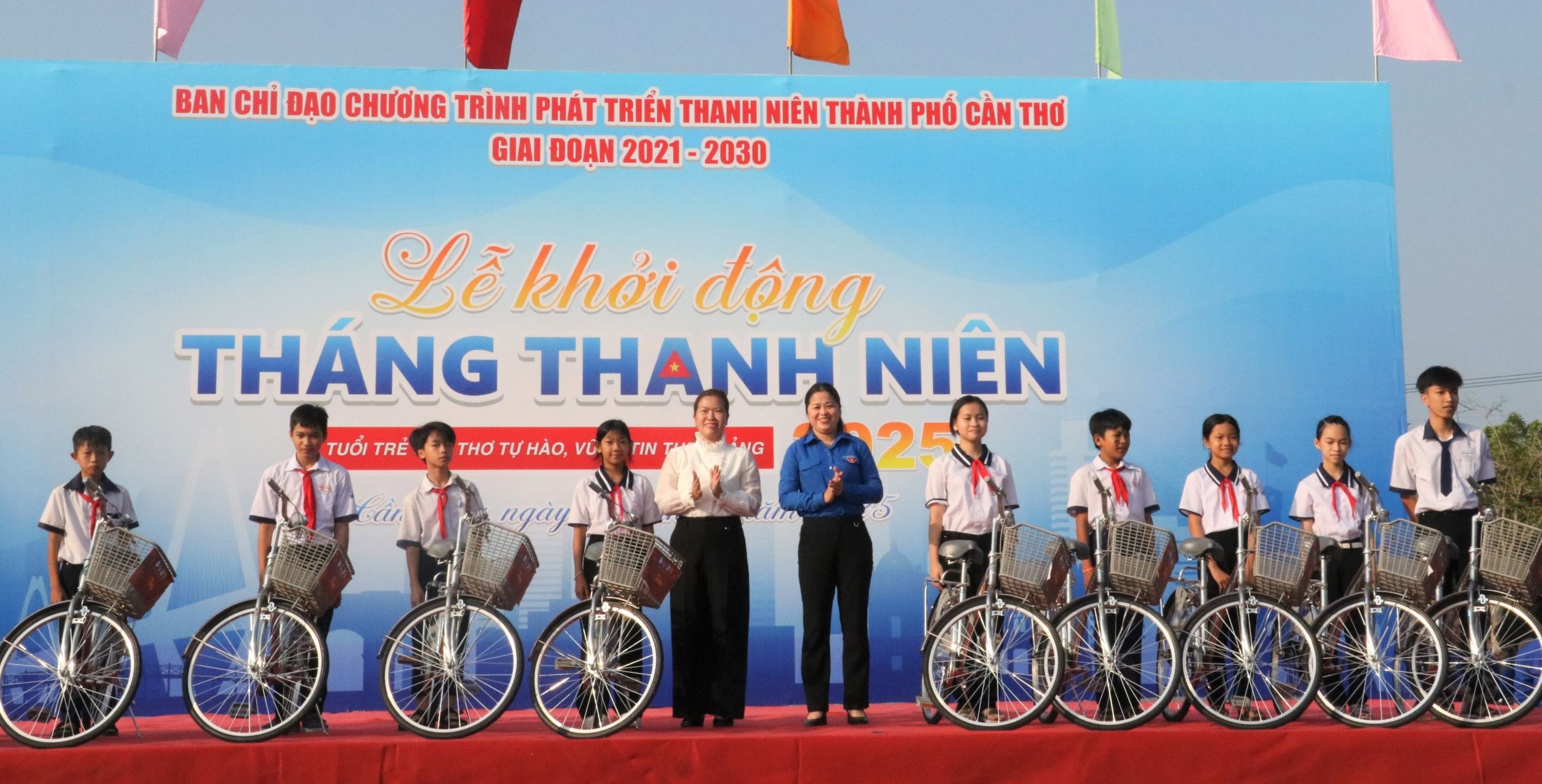 Đồng chí Nguyễn Thị Ngọc Điệp (thứ 5 từ trái qua), Phó Chủ tịch UBND TP Cần Thơ và chị Lư Thị Ngọc Anh, Bí thư Thành đoàn, trao xe đạp cho học sinh có hoàn cảnh khó khăn.