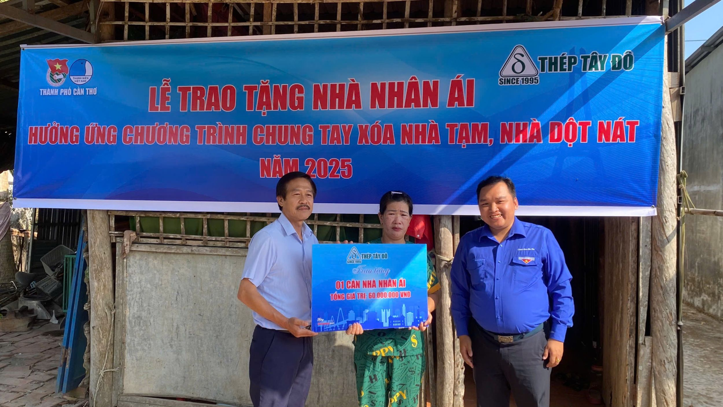 Đồng chí Nguyễn Tứ Thiên, Phó Bí thư Thành đoàn Cần Thơ và đại diện Công ty TNHH Thép Tây Đô hỗ trợ xây nhà nhân ái cho hộ có hoàn cảnh khó khăn ở xã Trường Long, huyện Phong Điền.