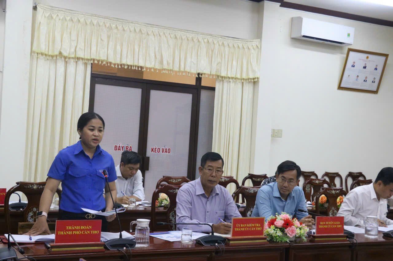 Đòng chí Lư Thị Ngọc Anh, Ủy viên BTV Trung ương Đoàn, Bí thư Thành đoàn Cần Thơ báo cáo tại buổi làm việc