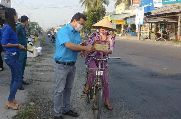 ĐVTN phát tờ rơi tuyên truyên dịch Covid-19 cho người dân trên địa bàn huyện Vĩnh Thạnh.
