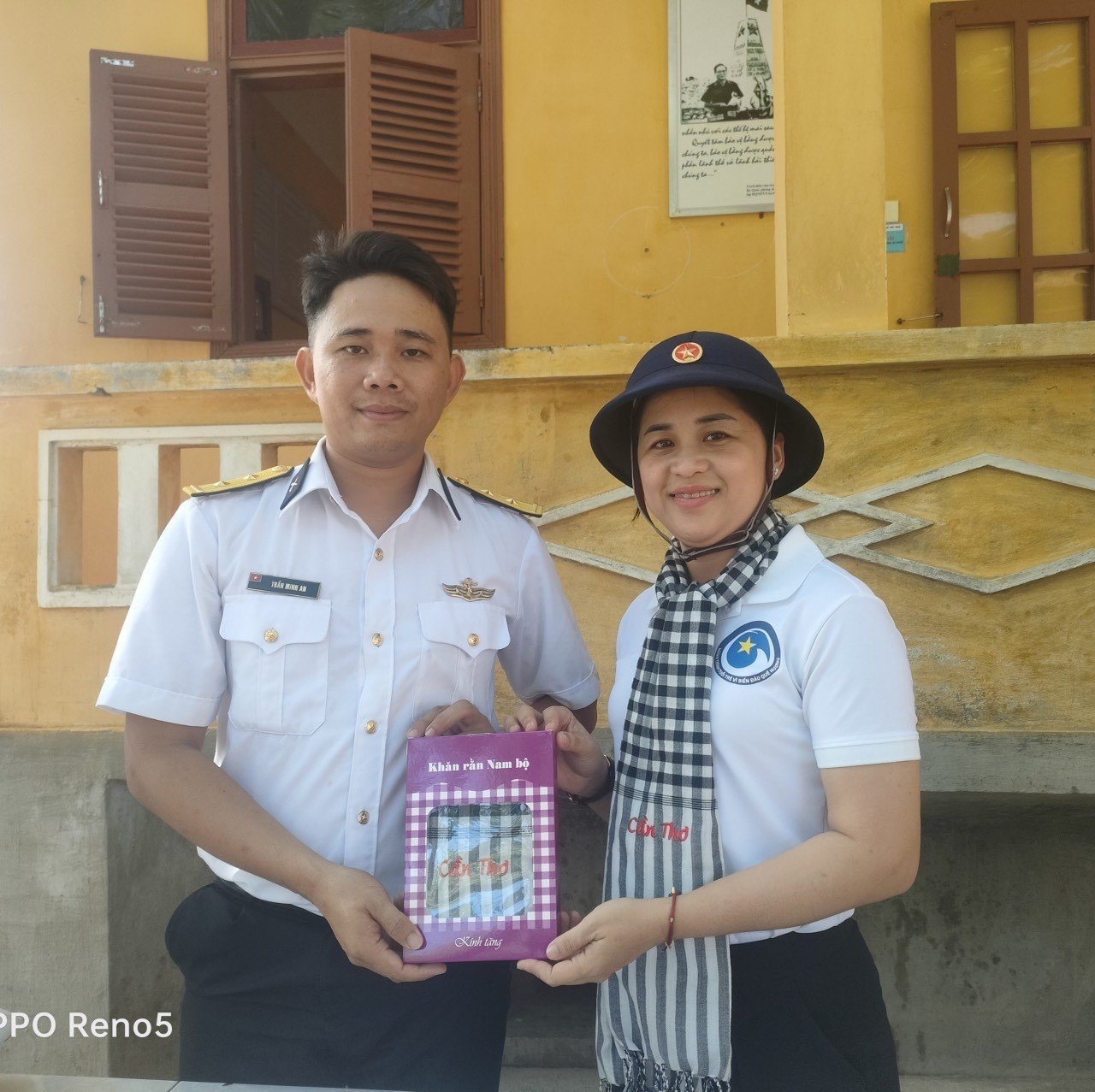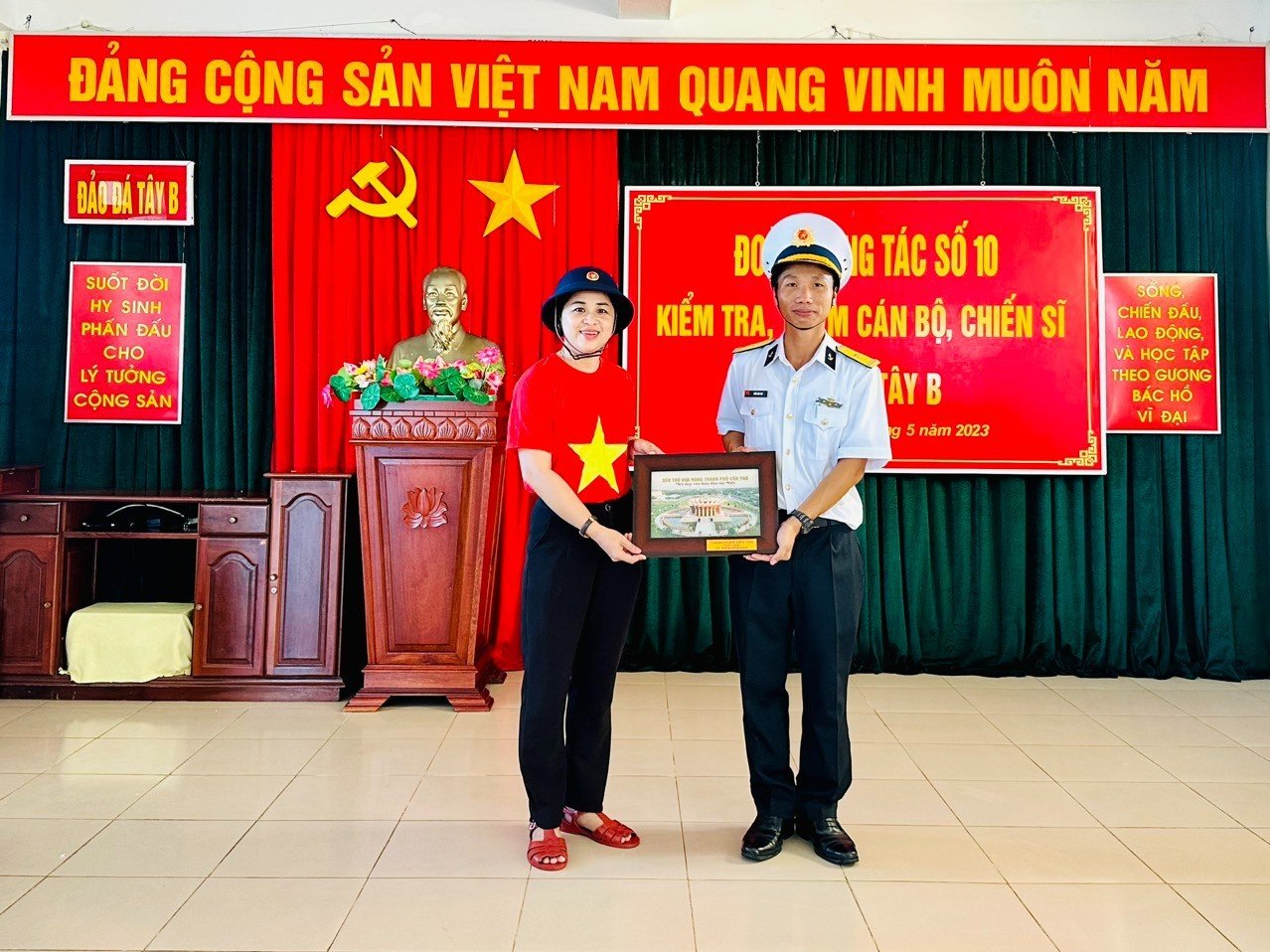 Đồng chí Lư Thị Ngọc Anh, Ủy viên Ban Thường vụ Trung ương Đoàn, Bí Thư Thành đoàn Cần Thơ trao tặng các vật phẩm, quà lưu niệm cho cán bộ, chiến sĩ công tác tại Trường Sa và Nhà gian DK1.