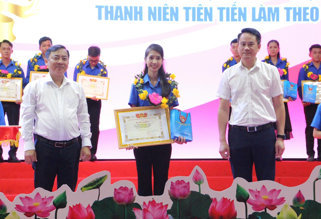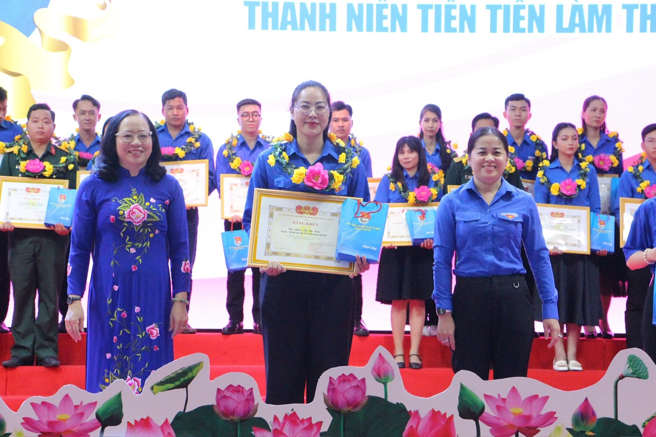 Đồng chí Nguyễn Kim Quy, UVBTV, Trưởng Ban Đoàn kết tập hợp Thanh niên Trung ương Đoàn, Phó Chủ tịch TT Hội LHTN Việt Nam và đồng chí Đào Chí Nghĩa, Thành uỷ viên, Phó Trưởng Đoàn đại biểu Quốc hội chuyên trách thành phố Cần Thơ tuyên dương gương tiên tiến. Ảnh: Kim Hai