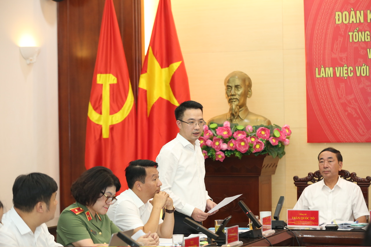 Chủ trì buổi làm việc có Thượng tướng Trần Quốc Tỏ, Uỷ viên Ban Chấp hành Trung ương Đảng, Phó Bí thư Đảng ủy Công an Trung ương, Thứ trưởng Bộ Công an, thành viên Ban Chỉ đạo, Trưởng đoàn khảo sát số 1; đồng chí Lê Tấn Dũng, Phó Bí thư Ban cán sự đảng, Thứ trưởng Bộ LĐ-TB&XH.