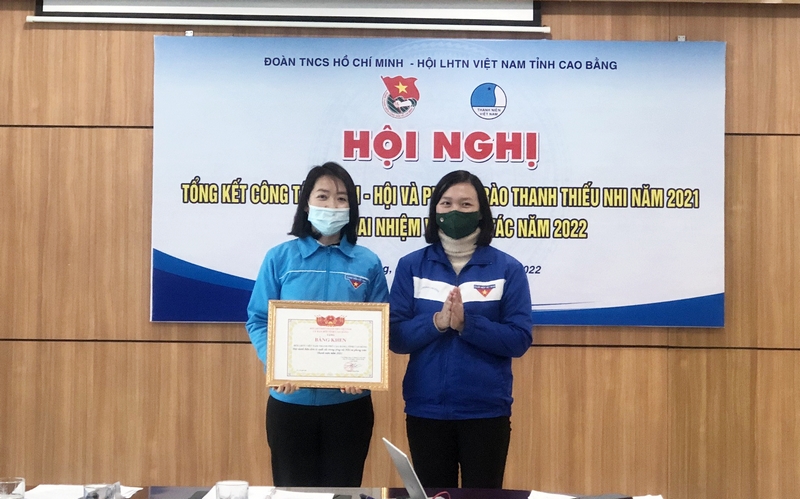 Chị Hoàng Hồng Diệu - Bí thư Tỉnh Đoàn, Chủ tịch Hội LHTN Việt Nam tỉnh trao bằng khen cho cá nhân có thành tích xuất sắc trong công tác Hội và phong trào thanh niên năm 2021.