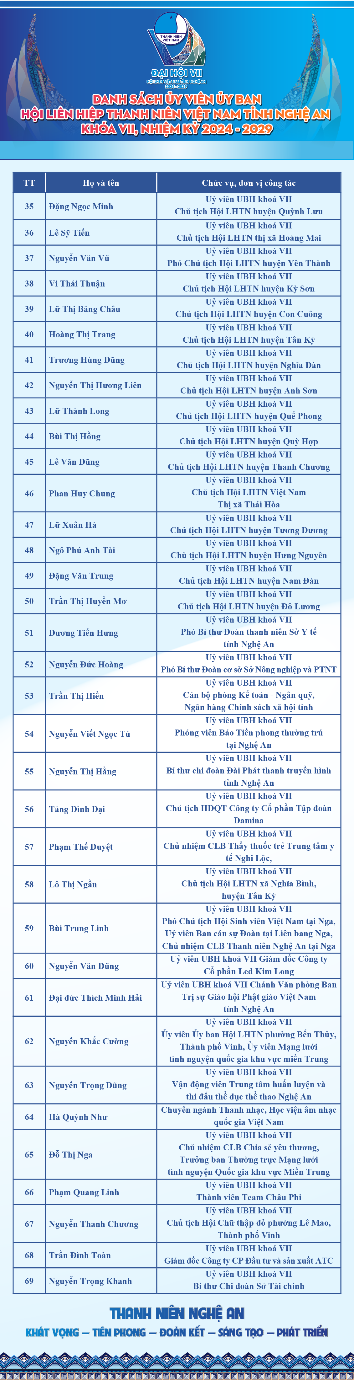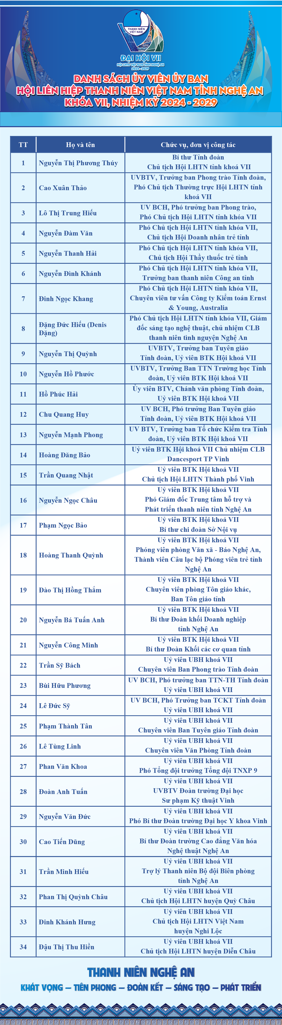 Danh sách Ủy viên Ủy ban Hội LHTN Việt Nam tỉnh Nghệ An nhiệm kỳ 2024-2029. |