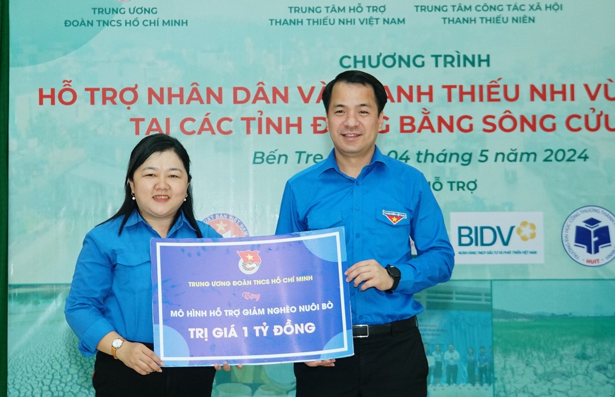 Đồng chí Ngô Văn Cương - Bí thư T.Ư Đoàn trao tặng mô hình hỗ trợ giảm nghèo nuôi bò trị giá 1 tỷ đồng cho tỉnh Bến Tre