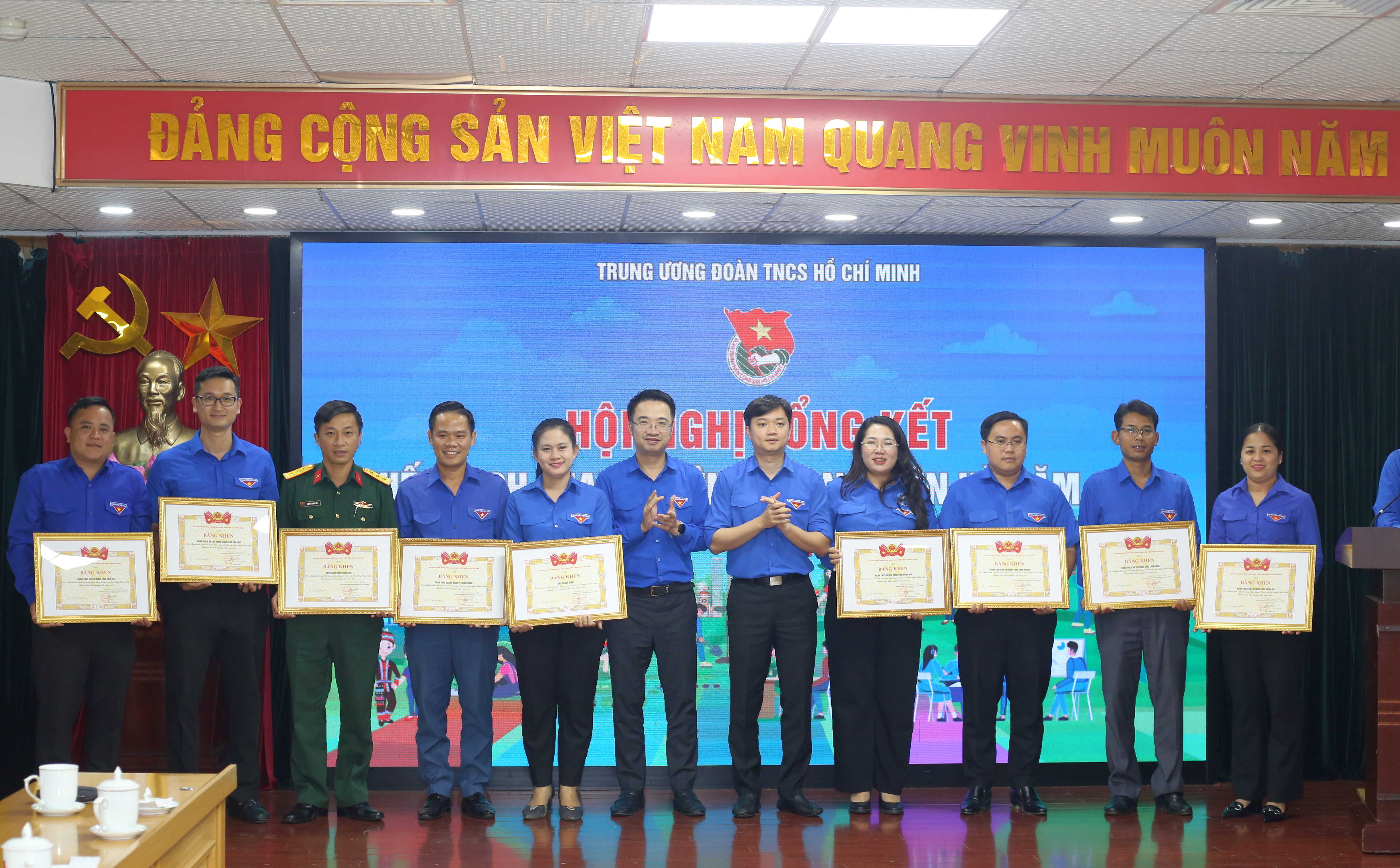 Đồng chí Nguyễn Tường Lâm, Bí thư TW Đoàn và đồng chí Nguyễn Minh Triết, Bí thư TW Đoàn tặng Bằng khen của BCH TƯ Đoàn cho các cá nhân tập thể tỉnh, thành đoàn, đoàn trực thuộc đã có thành tích xuất sắc trong triển khai, thực hiện Chiến dịch Thanh niên tình nguyện hè 2024