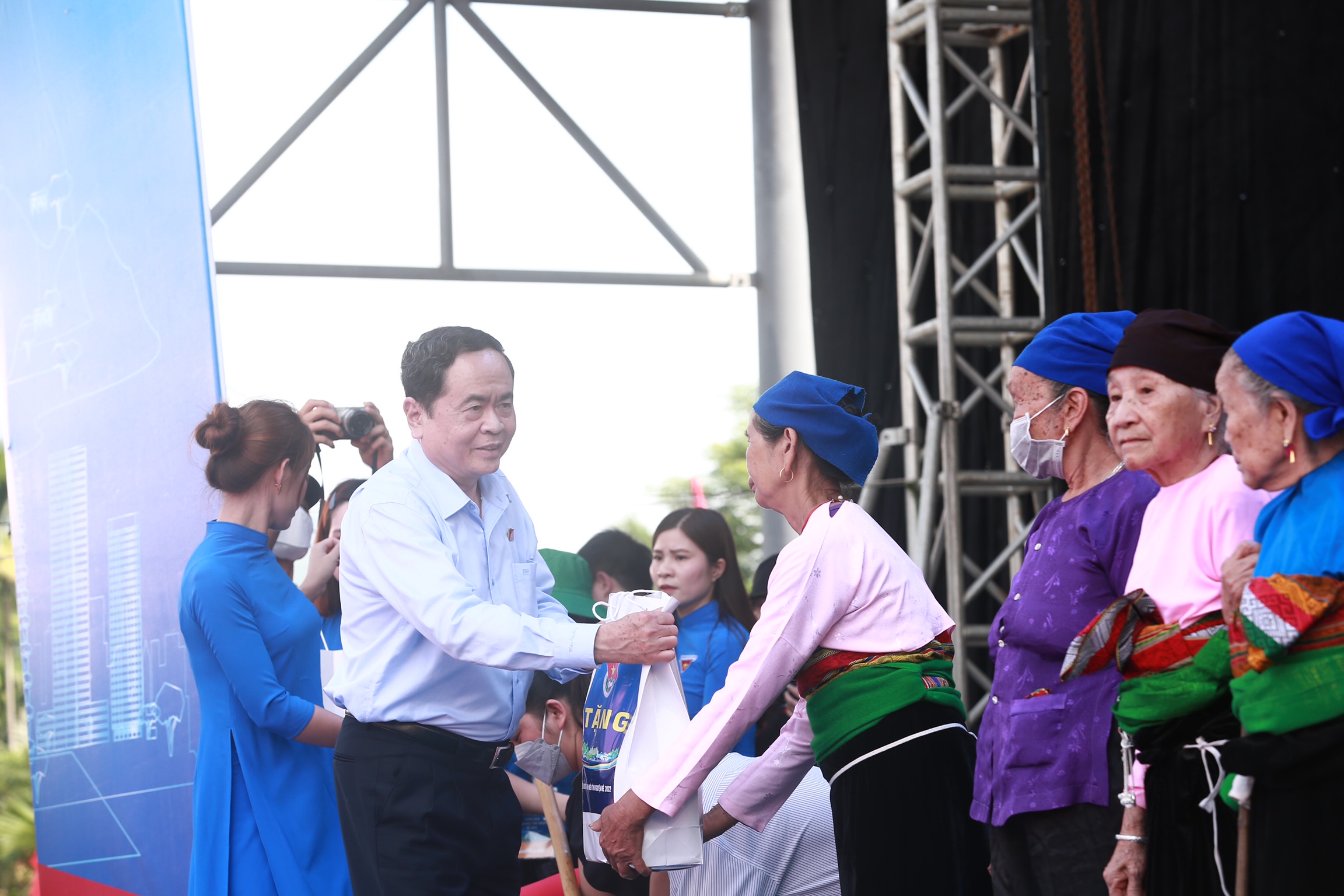 Đồng chí Đỗ Văn Chiến, Chủ tịch Ủy ban Trung ương Mặt trận Tổ quốc Việt Nam và đồng chí Bùi Quang Huy, Bí thư thường trực Trung ương Đoàn trao tặng quà cho ĐVTN dân tộc thiểu số