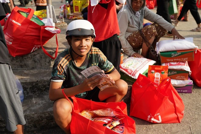 Bà E bảo 70 năm cuộc đời ở vùng xa xôi, chưa bao giờ thấy tết vui đến thế. Sáng sớm ngày cuối tháng chạp, bà cầm phiếu mua hàng tổng trị giá hơn 500.000 đồng bắt xe ôm đến phiên chợ, được tình nguyện viên lấy giúp từng món bà cần.
