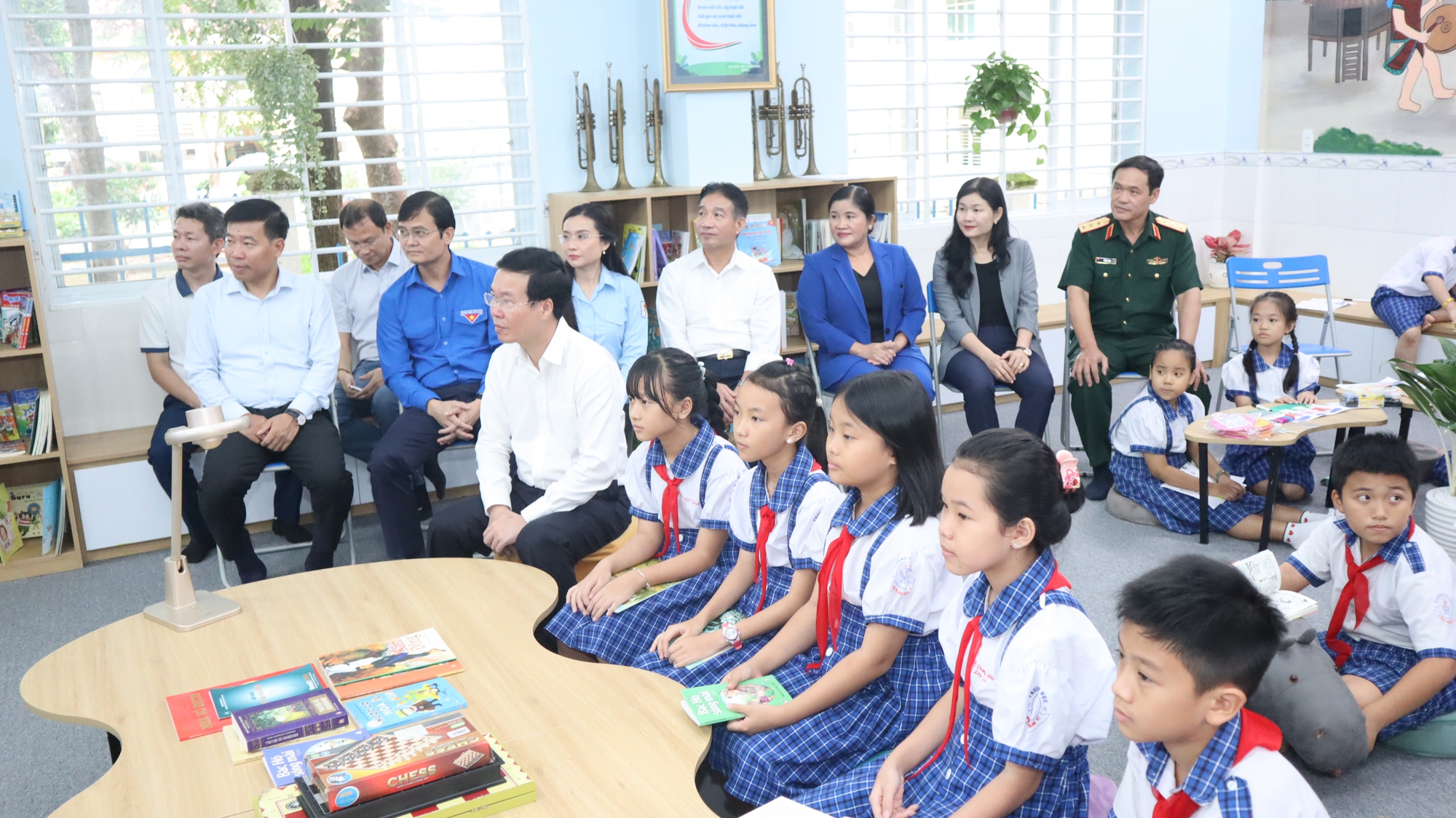 Chủ tịch nước Võ Văn Thưởng cùng các đại biểu tại công trình "Không gian đọc sách, tương tác và sinh hoạt Đội" vừa được khánh thành