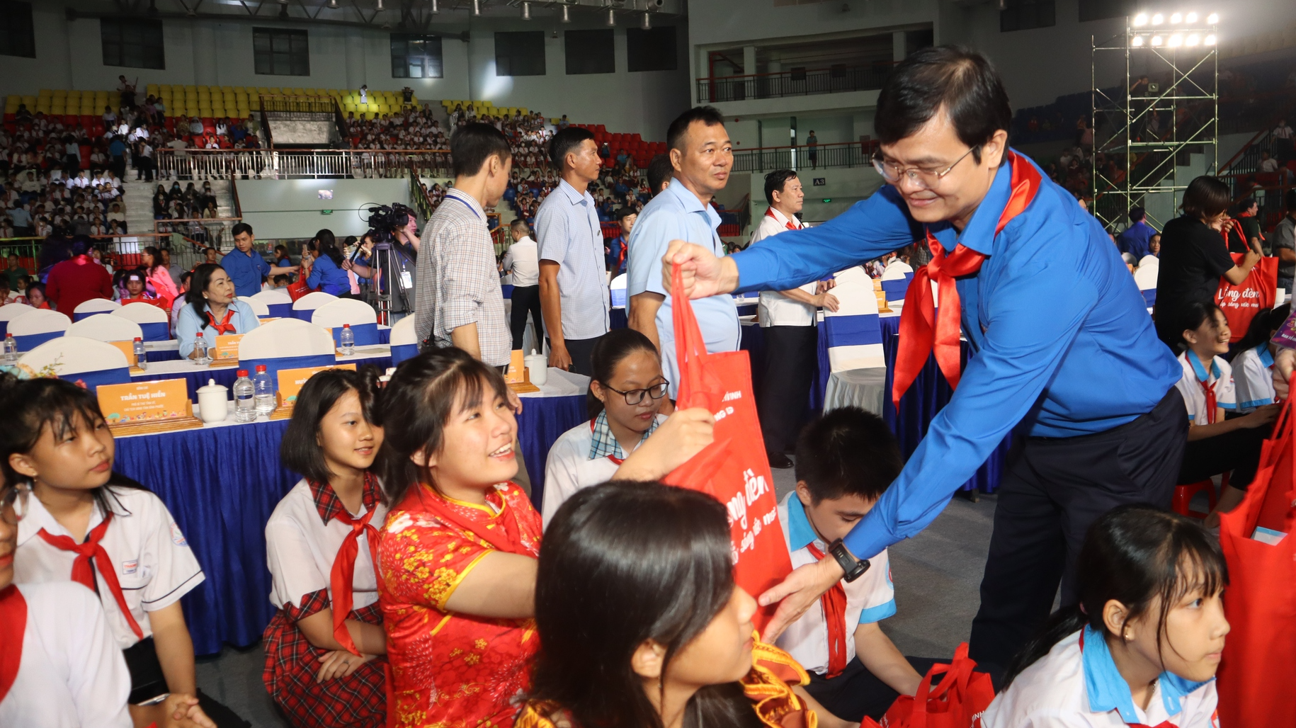 Bí thư T.Ư Đoàn, Chủ tịch Hội đồng Đội T.Ư Nguyễn Phạm Duy Trang tặng quà cho thiếu nhi