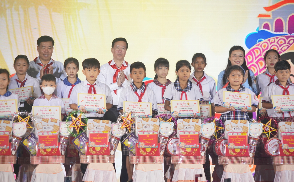 Chủ tịch nước Võ Văn Thưởng trao học bổng cho các thiếu nhi có hoàn cảnh khó khăn, mồ côi cha mẹ, mồ côi do COVID-19 của các tỉnh Đồng Nai, Bình Dương, Tây Ninh và Thành phố Hồ Chí Minh. (Ảnh: An Đăng/TTXVN)