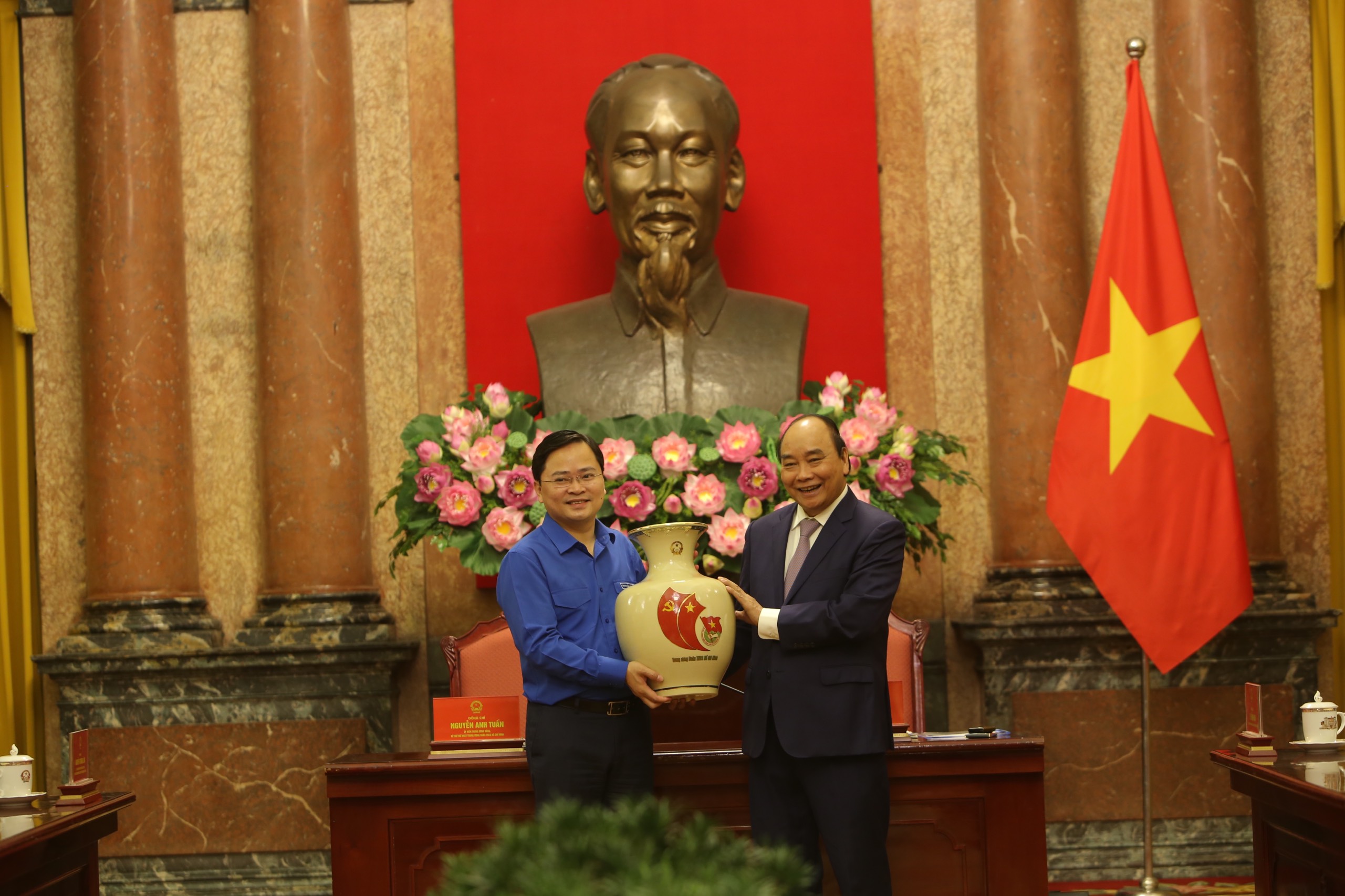 Chủ tịch nước Nguyễn Xuân Phúc trao tặng quà cho Bí thư thứ nhất Trung ương Đoàn Nguyễn Anh Tuấn