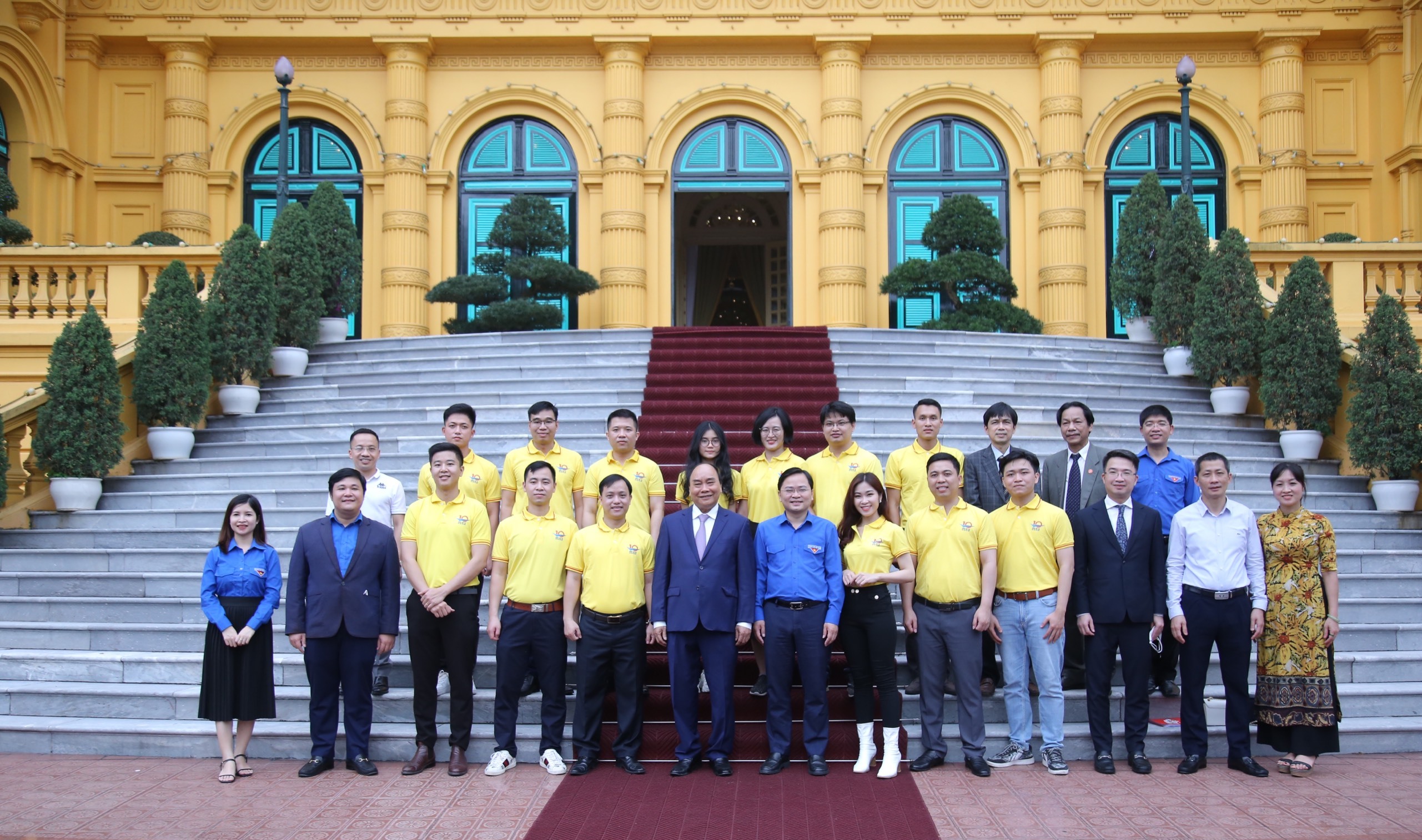 Chủ tịch nước Nguyễn Xuân Phúc, Bí thư thứ nhất Trung ương Đoàn Nguyễn Anh Tuấn cùng các đồng chí lãnh đạo chụp hình lưu niệm với các gương mặt trẻ tiêu biểu