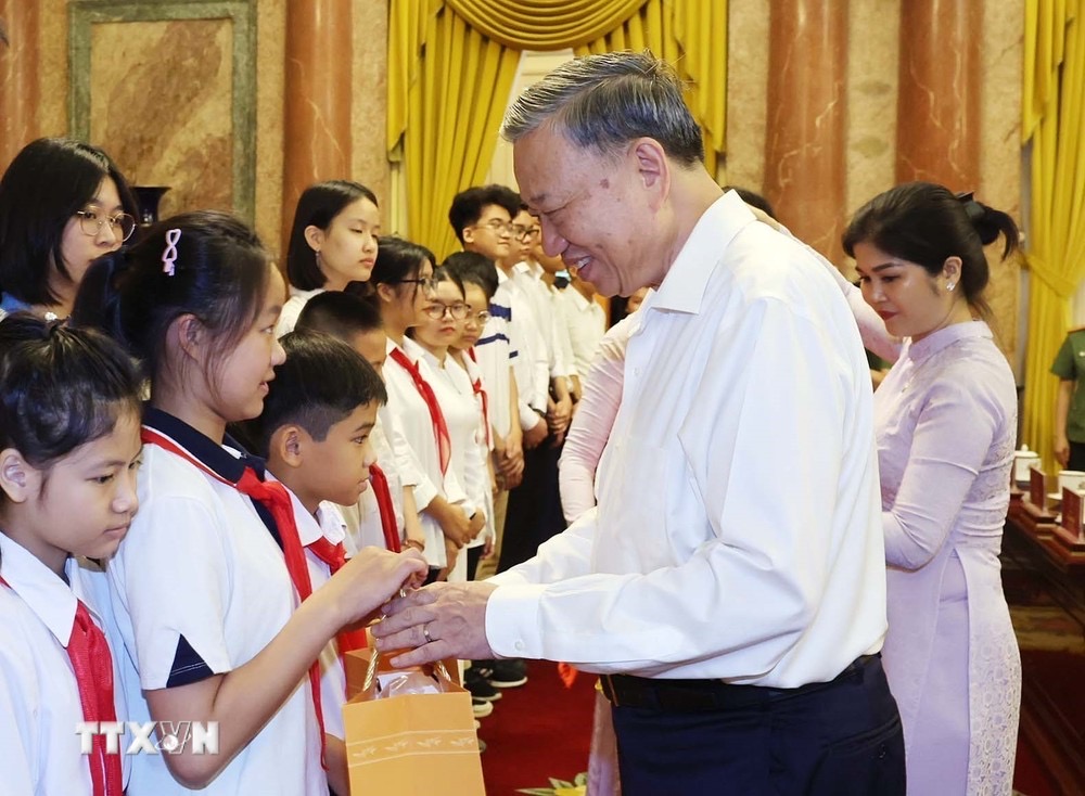 Chủ tịch nước Tô Lâm tặng quà cho các thanh thiếu niên tiêu biểu. (Ảnh: Nhan Sáng/TTXVN)