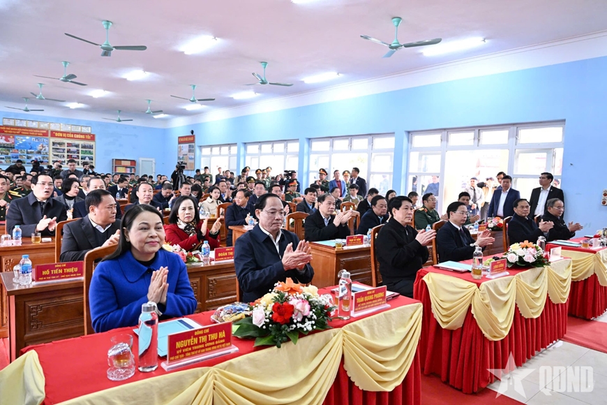 Cán bộ, chiến sĩ và các cháu thiếu nhi đón Chủ tịch nước Lương Cường và các đại biểu thăm Trung đoàn 123