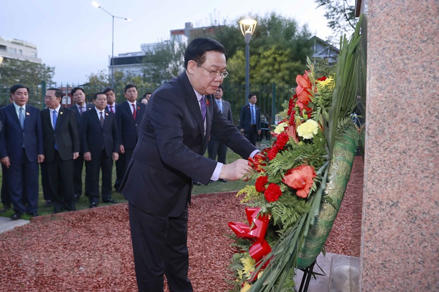 Trong khuôn khổ chuyến thăm chính thức Argentina, chiều 23/4/2023 (theo giờ địa phương), tại thủ đô Buenos Aires, Chủ tịch Quốc hội Vương Đình Huệ cùng đoàn đại biểu cấp cao Quốc hội Việt Nam đặt vòng hoa tại Tượng đài Chủ tịch Hồ Chí Minh.( Ảnh: Doãn Tấn/TTXVN)