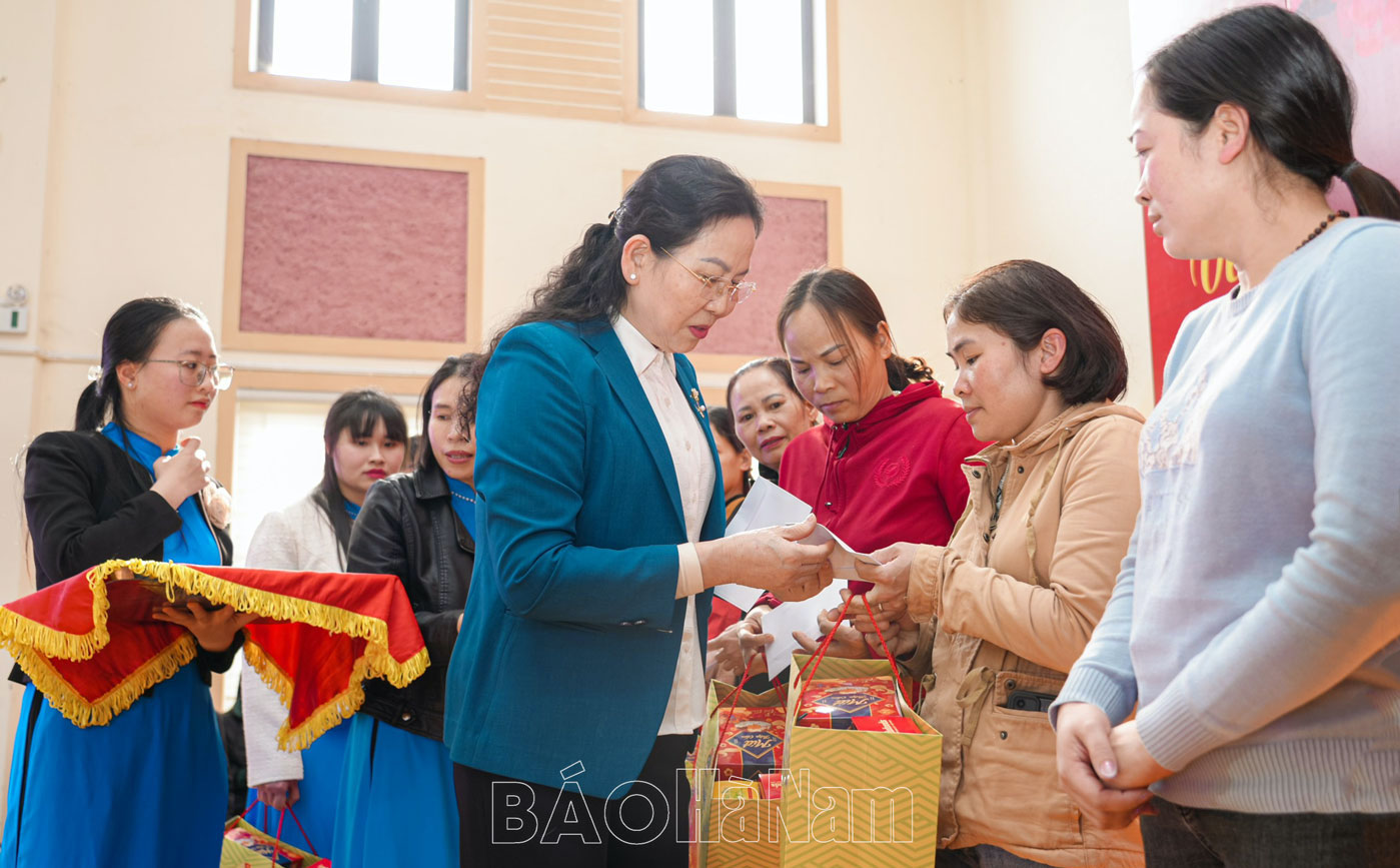 Đồng chí Lê Thị Thủy, Ủy viên Trung ương Đảng, Bí thư Tỉnh ủy, Chủ tịch HĐND tỉnh tặng quà cho công nhân có hoàn cảnh khó khăn tại KCN Châu Sơn, Phủ Lý