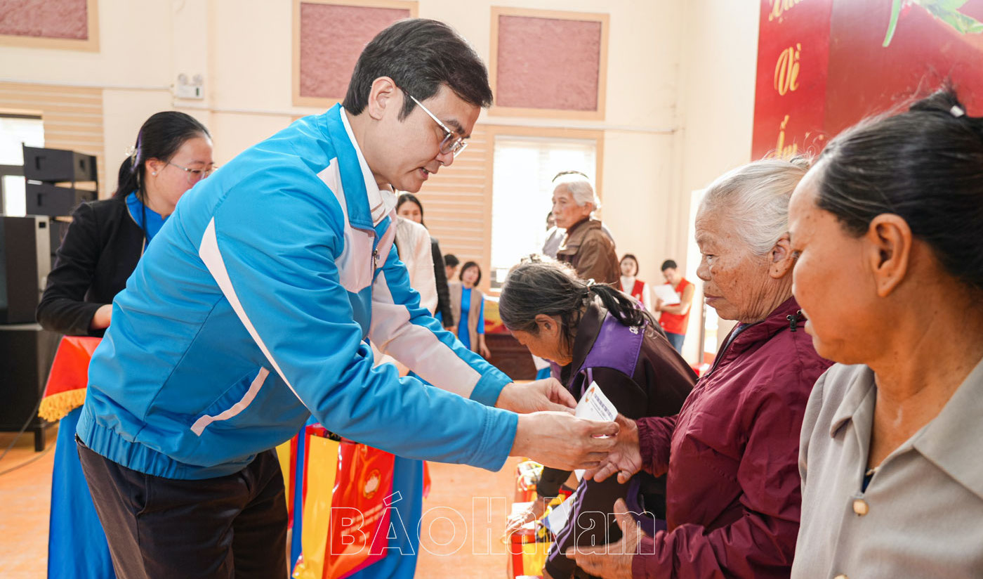 Đồng chí Bùi Quang Huy, Ủy viên dự khuyết Trung ương Đảng, Bí thư thứ nhất Trung ương Đoàn trao tặng quà Tết cho các hộ nghèo tại chương trình