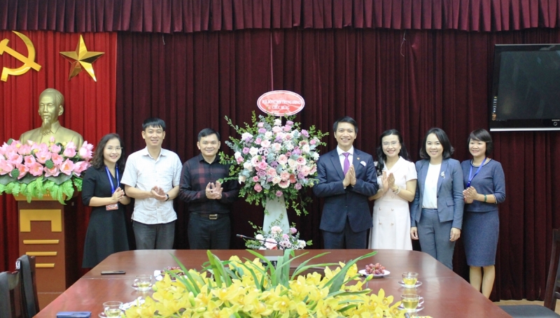 Đồng chí Nguyễn Ngọc Lương, Bí thư Trung ương Đoàn, Chủ tịch Hội đồng Đội Trung ương tặng hoa chúc mừng Ban Giám hiệu trường Lê Duẩn