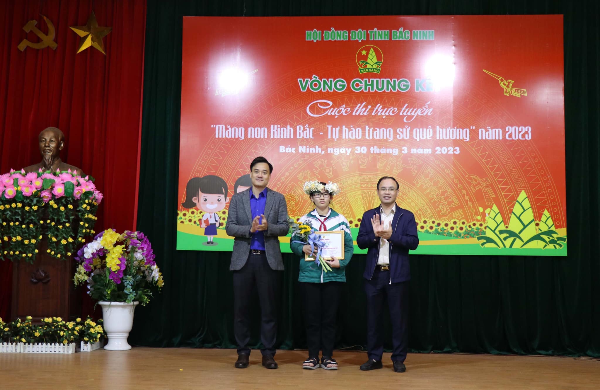 Đồng chí Trần Văn Đăng, Phó Bí thư tỉnh Đoản, Chủ tịch Hội đồng Đội tỉnh Bắc Ninh trao giải Nhất cho thí sinh
