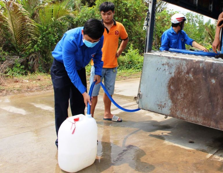 Ngoài trao bồn trữ nước, đoàn viên, thanh niên còn hỗ trợ nước ngọt cho người dân vùng hạn, mặn