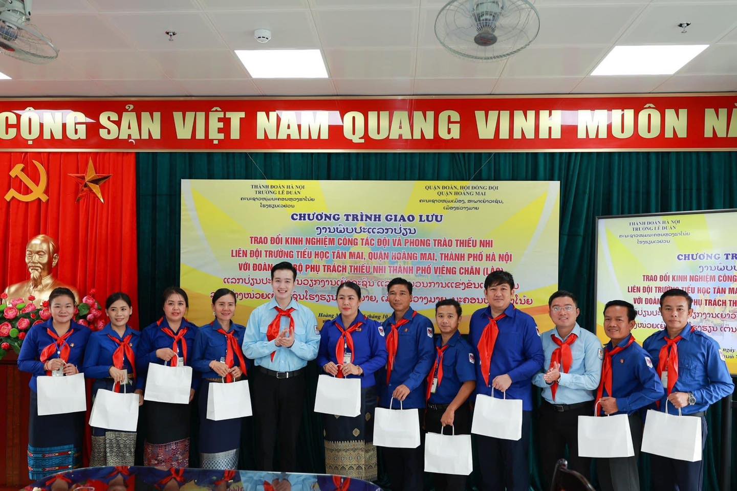 Trước đó, sáng 16/10, đoàn cán bộ Phụ trách thiếu nhi Thành phố Viêng Chăn, Lào đã có chương trình giao lưu, tham quan học tập kinh nghiệm công tác Đội và phong trào thiếu nhi với liên đội trường Tiểu học Tân Mai, quận Hoàng Mai. Đây là một ngôi trường có bề dày thành tích hơn 60 năm của quận Hoàng Mai với cơ sở vật chất khang trang, hiện đại.