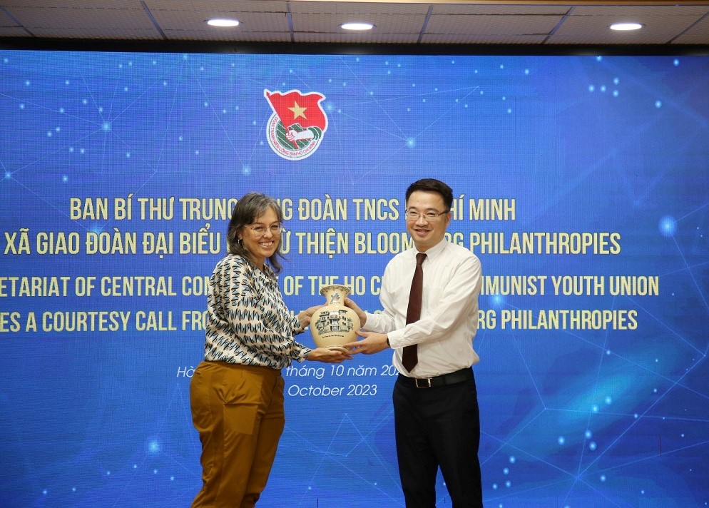 Đồng chí Nguyễn Tường Lâm- Bí thư Trung ương Đoàn, Phó Chủ nhiệm Thường trực UBQG về thanh niên Việt Nam tặng quà lưu niệm cho Bà Betsy Fuller, Quản lý chương trình cấp cao Chương trình y tế cộng đồng, Quỹ từ thiện Bloomberg