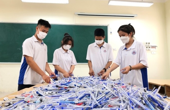 Học sinh trường THCS Phú Cường (Hà Nội) kiểm đếm vỏ bút thu gom để đổi học bổng cho các học sinh nghèo hiếu học