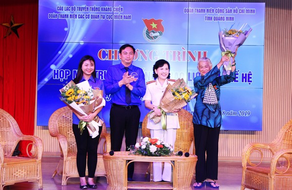 Đ/c Lê Hùng Sơn, Bí thư Tỉnh đoàn Quảng Ninh tặng hoa các đại biểu chương trình “giao lưu hai thế hệ”