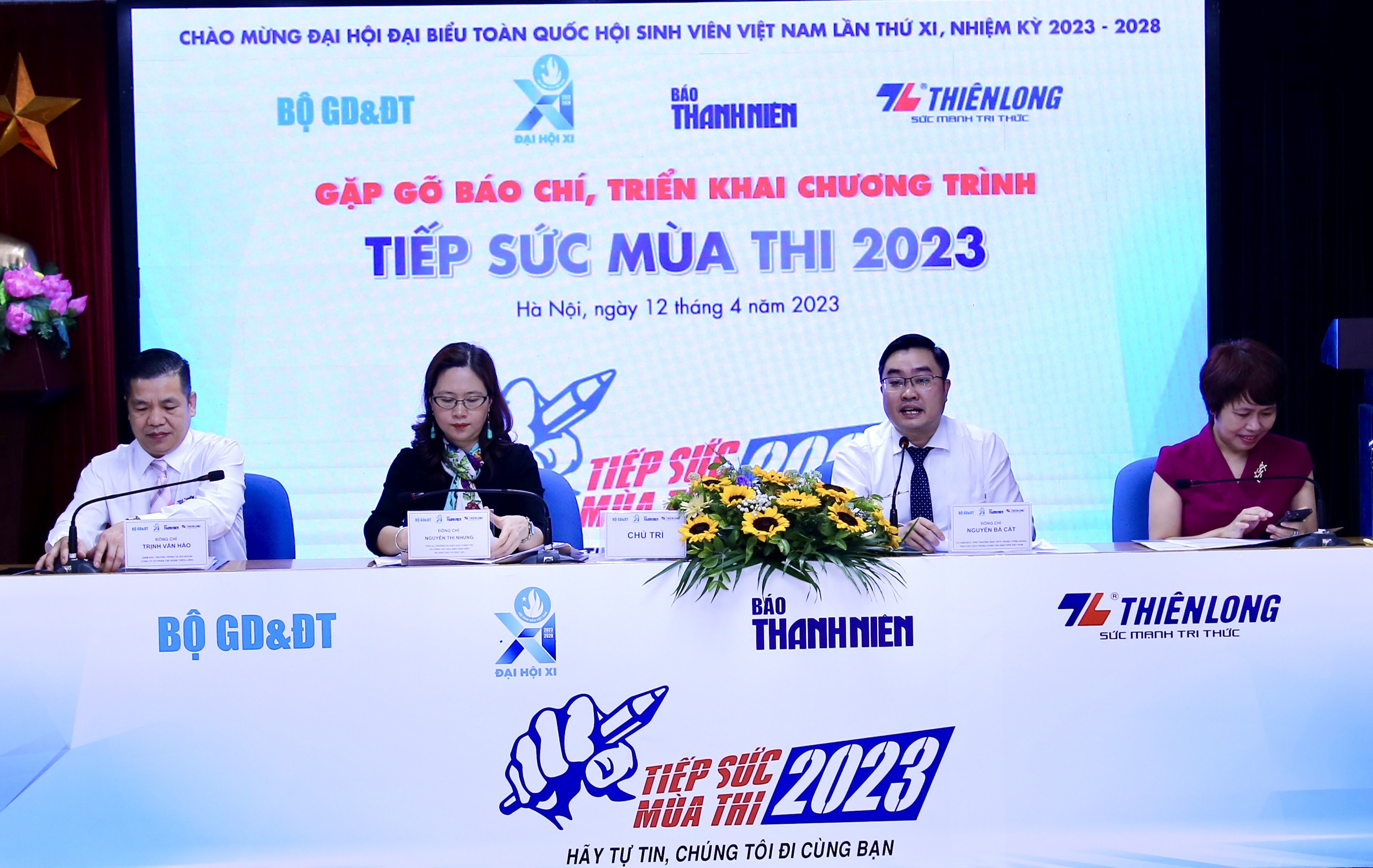 Đồng chí Nguyễn Minh Triết, Bí thư T.Ư Đoàn, Chủ tịch Hội SVVN tặng hoa cho đại diện các chương trình đồng hành tổ chức chương trình Tiếp sức mùa thi năm 2023