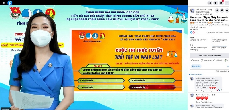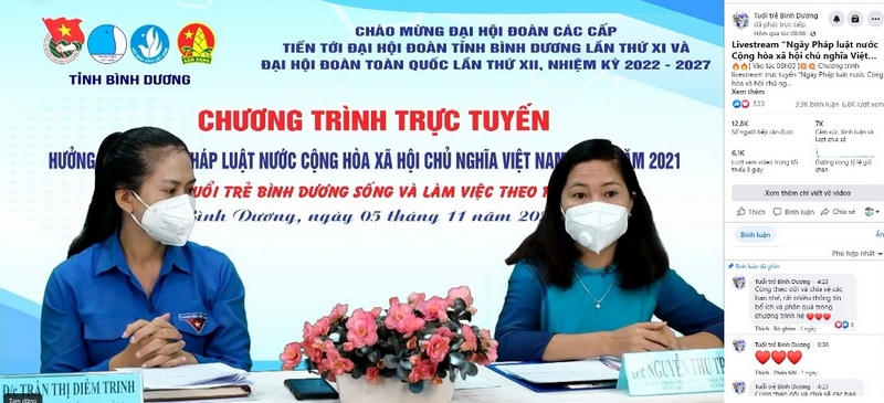Chương trình trực tuyến hưởng ứng “Ngày pháp luật Việt Nam 9/11” do Ban Thường vụ Tỉnh Đoàn Bình Dương tổ chức được phát sóng trực tiếp trên các trang mạng xã hội của Đoàn – Hội – Đội cấp tỉnh, đơn vị sự nghiệp trực thuộc Tỉnh Đoàn và sự chia sẻ, theo dõi đồng loạt của các cơ sở Đoàn toàn tỉnh.