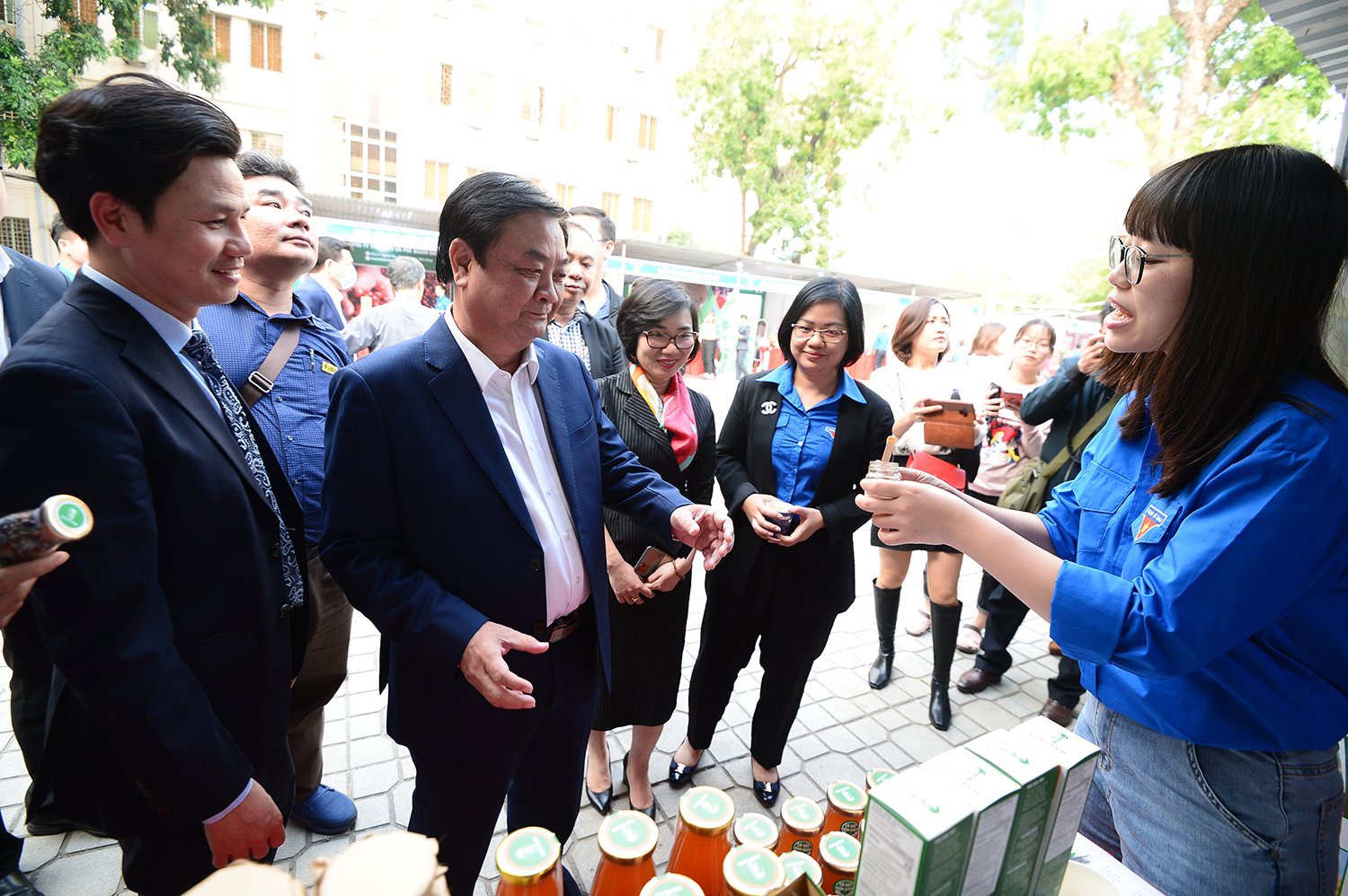 Đồng chí Lê Minh Hoan- Ủy viên T.Ư Đảng, Thứ trưởng Bộ Nông nghiệp và Phát triển nông thôn cùng các đồng chí lãnh đạo T.Ư Đoàn tham quan gian hàng khởi nghiệp của thanh niên