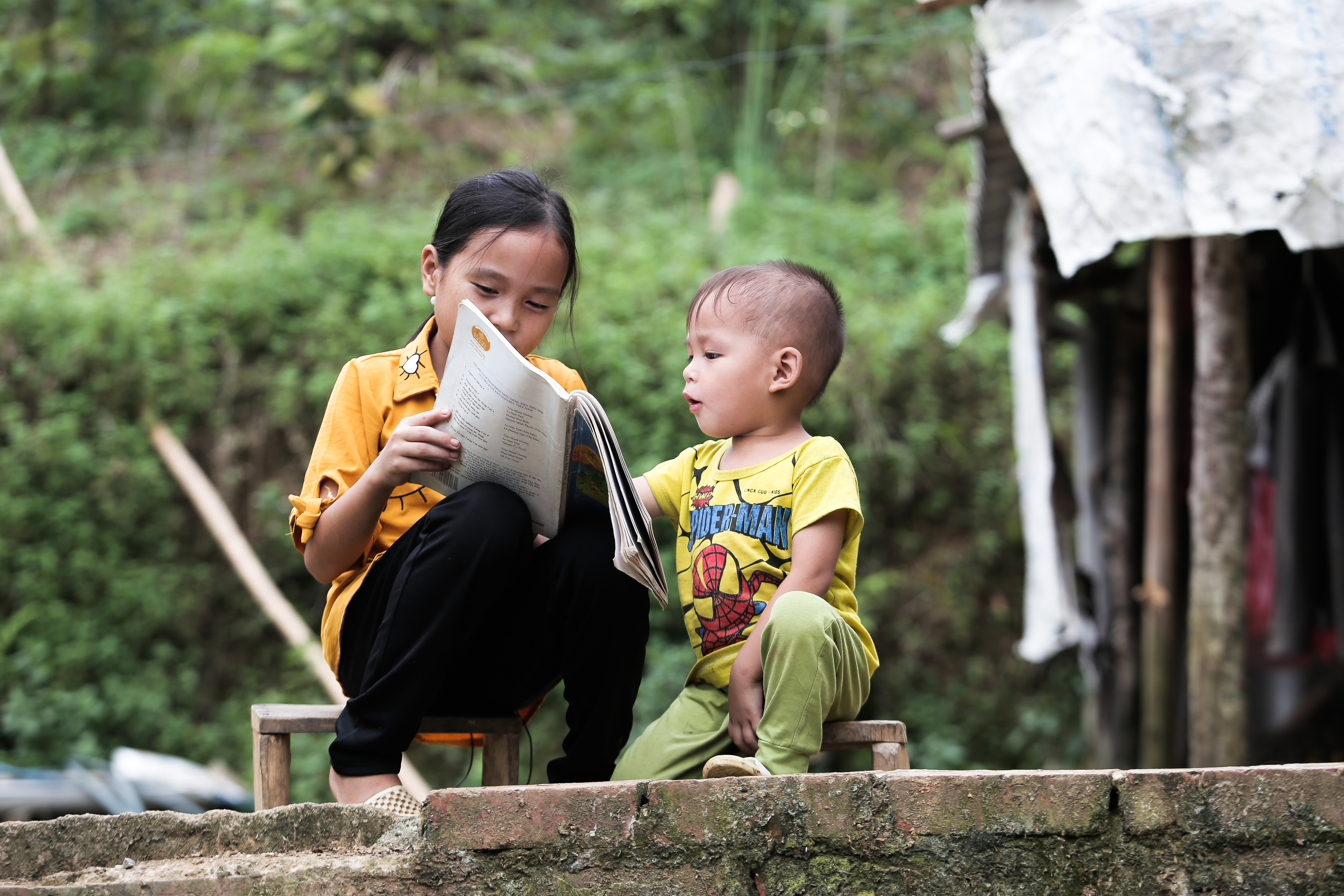 Hết con dốc lại đến con suối. Lan bảo, con suối là “ác mộng” của em vào mỗi mùa mưa. Khi ấy nước suối dâng cao, chảy siết, người lớn qua còn khó. Em có qua được thì cũng ướt nhẹp đến đầu gối, nước bắn tung tóe lên sách vở. Mùa khô này, nước chỉ chạm cổ chân, Lan vẫn có thể vừa cõng em vừa khéo léo ven theo hàng sỏi cao để sang bờ bên kia. Cậu em trai nằm im trên lưng chị, ngoan ngoãn ôm lấy cổ chị.