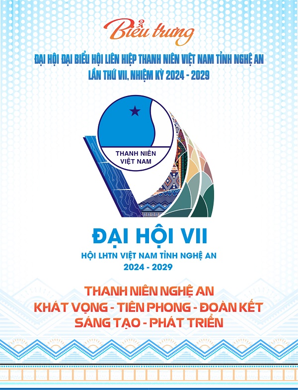 Biểu trưng của Đại hội là hình ảnh số VII cách điệu tạo hình khối vững chãi, làm nổi bật phẩm chất của thanh niên Nghệ An thời kỳ mới: hiếu học, tiên phong, bản lĩnh, đoàn kết, sáng tạo, hội nhập. Tổng thể mang hình tượng cánh buồm căng gió đang tiến về phía trước, mang theo trong mình sức mạnh văn hóa dân tộc, bản lĩnh “cây tre”Việt Nam, cuộc cách mạng 4.0.