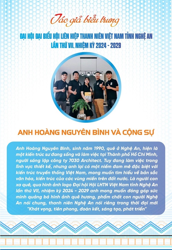 Biểu trưng được thiết kế bởi Anh Hoàng Nguyên Bình, sinh năm 1990, quê ở Nghệ An, hiện là một kiến trúc sư đang sống và làm việc tại Thành phố Hồ Chí Minh, người sáng lập công ty 7030 Architect. Là người con xa quê, qua hình ảnh logo Đại hội Hội LHTN Việt Nam tỉnh Nghệ An anh mong muốn đóng góp sức mình quảng bá hình ảnh quê hương, phẩm chất con người Nghệ An nói chung, thanh niên nghệ an nói riêng trong thời đại mới.