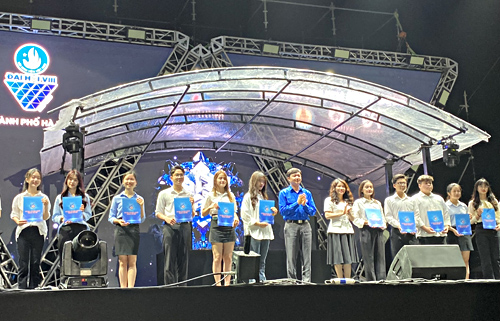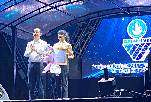 Phó Bí thư Thành đoàn, Chủ tịch Hội Sinh viên Việt Nam thành phố Hà Nội Nguyễn Tiến Hưng trao Bằng khen cho tác giả Vũ Thị Huyền Ngọc, tác giả ca khúc chính thức Đại hội đại biểu Hội Sinh viên Việt Nam thành phố Hà Nội lần thứ VIII.