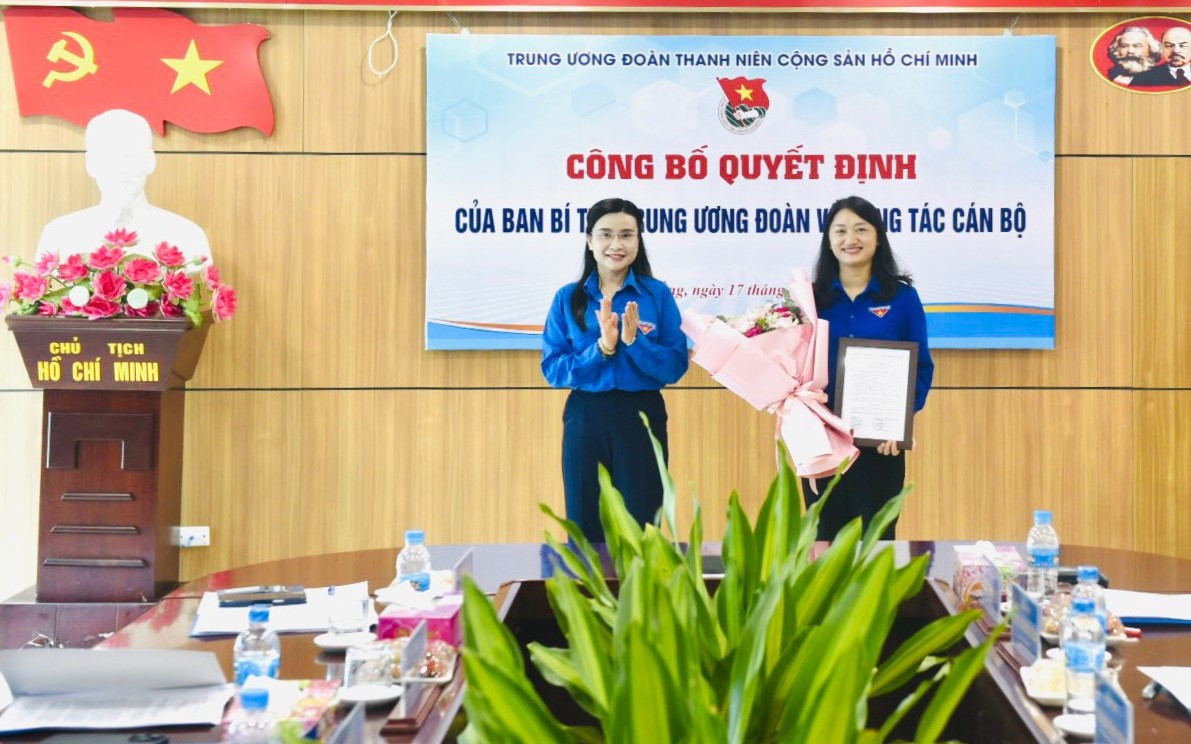 Đồng chí Nguyễn Phạm Duy Trang - Bí thư Trung ương Đoàn, Chủ tịch Hội đồng Đội Trung ương trao Quyết định và tặng hoa chúc mừng Tân Bí thư Tỉnh đoàn Triệu Thanh Dung